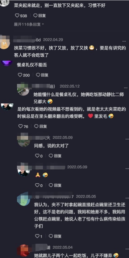 网友表示每次看她的视频最不想看到的就是老太太夹菜,吃的时候总是在里头翻来翻去翻去的非常难受。一点儿餐桌礼仪都没有,幸好只有她跟李玉成吃,李玉成不嫌弃,如果和客人一块吃饭的话,要她这种吃法,别人都不想吃这道菜了。