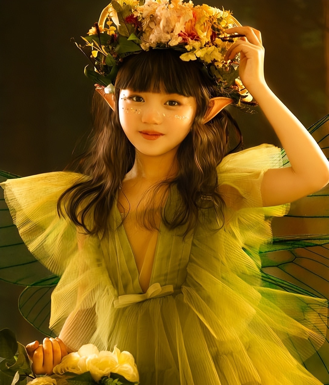 头上戴着一个花环,穿着浅蓝色纱纱的连衣裙,戴着2个精灵的耳朵的造型,别提有多么的俏皮可爱了。加上化妆师还在小山竹的脸颊处,增加了亮片的设计,显得更诱人了。