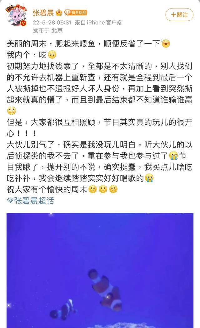 “被张碧晨气死”、“被张碧晨笑死”的热搜一直居高不下,大家都在讨论说:“张碧晨玩游戏玩不明白”、“张碧晨没主见”、“张碧晨还是回去好好唱歌吧,不要上侦探类节目了”。而张碧晨也是在凌晨六点多发微博给大家道歉,表示:“自己真的是玩游戏玩不明白,以后会好好唱歌的,不再参加侦探类的节目了”