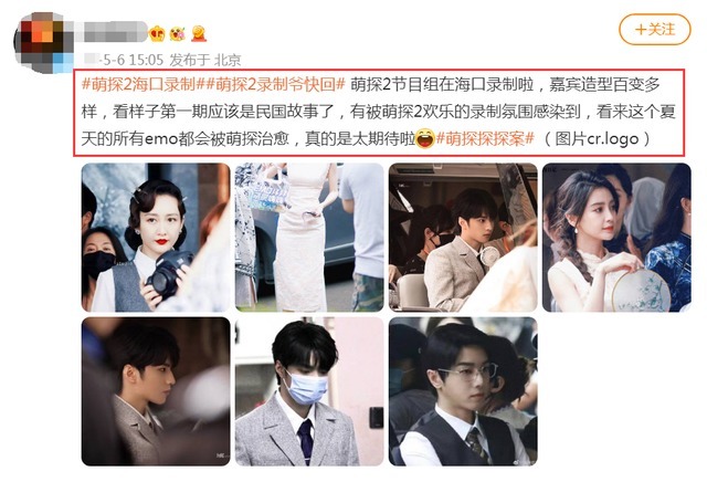 果不其然,随后网友就在网上曝出了关于《萌探2》录制现场的照片,从嘉宾们的造型上看,也都是民国时期的服饰,男嘉宾西装革履,十分帅气,女嘉宾旗袍加身,性感魅力四射,不过,大家最关心的还是这一季“萌探家族”的成员。