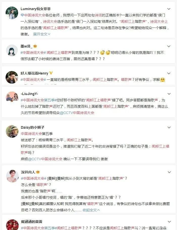 《中国诗词大会》第五季第五期有一道题目,“杨柳青青江水平,闻郎江上唱歌声”和“杨柳青青江水平,闻郎江上踏歌声”,两个选项,划去错误项,留下正确的。选手陈籽妍划掉的是“杨柳青青江水平,闻郎江上踏歌声”,答对了。也就是说,正确的诗句是“杨柳青青江水平,闻郎江上唱歌声”。