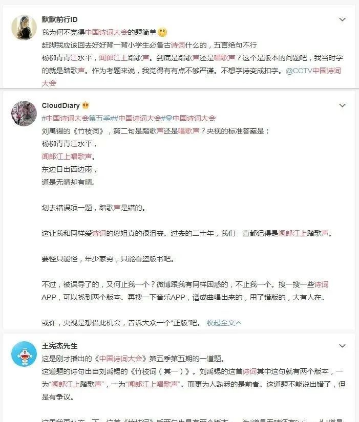 有人不服,说正确读法不是“杨柳青青江水平,闻郎江上踏歌声”吗?怎么可能是“唱歌声”呢?我搜索了一下,有这样疑问的人还真多。有人说他念了20年书都是这么读的,有人说他热爱诗词的怒姐也是这么读的,有人说他家里人都是这么读的,甚至,有人把网上的“踏歌声”版本截图下来,真的是有书为证呀。一句话,就是要证明“杨柳青青江水平,闻郎江上踏歌声”也是对的。