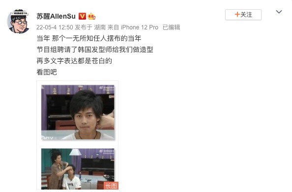 看到自己当年的发型,其他人都没啥反应,而苏醒则发声吐槽到「再多文字表达都是苍白的」,并且还晒出了当初发型师给他做发型的截图。看得出来,他也是很不满意自己当年的发型。