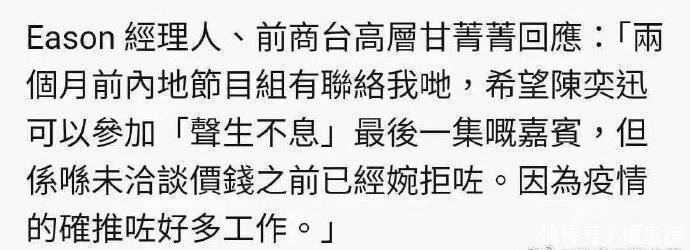 而这些都是网友的爆料,在媒体就陈奕迅自降片酬参加《声生不息》一事向陈奕迅一方咨询时,陈奕迅经纪人甘菁菁回应:「两个月前内地节目组有联系我们,希望陈奕迅可以参加《声生不息》最后一集的嘉宾,但是在未洽谈价钱之前已经婉拒了。因为疫情的确推掉了很多工作。」