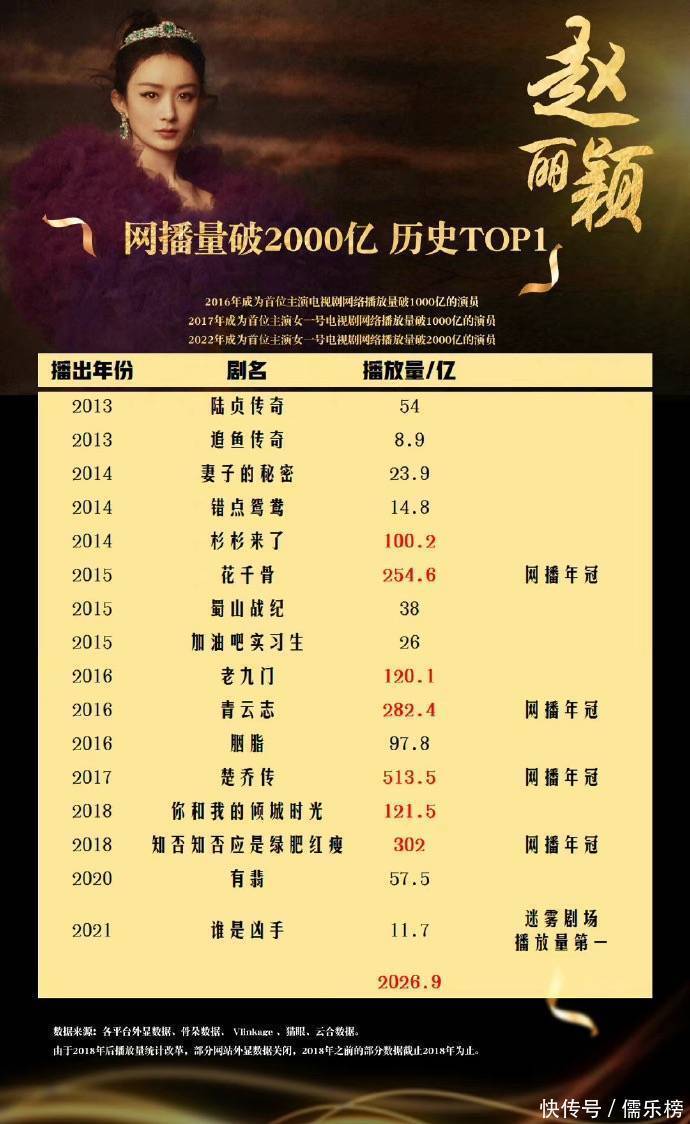 而两人的业务能力也是网友们一直争议的焦点,近日,这个问题就有结果了。有网友发现,赵丽颖成为首位达成主演电视剧网播量破2000亿的演员,其中有7部作品的网播量破百亿,4部作品是网播年冠。