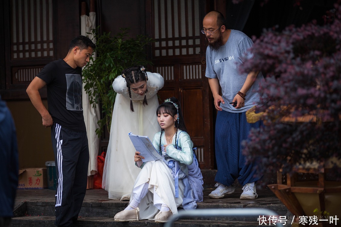 这是导演和女主及二号。演员们已经化好妆,正在背着台词,导演在一旁讲戏,具体要怎么演,要想达到什么样的效果,有时还会上去亲自示范一次。